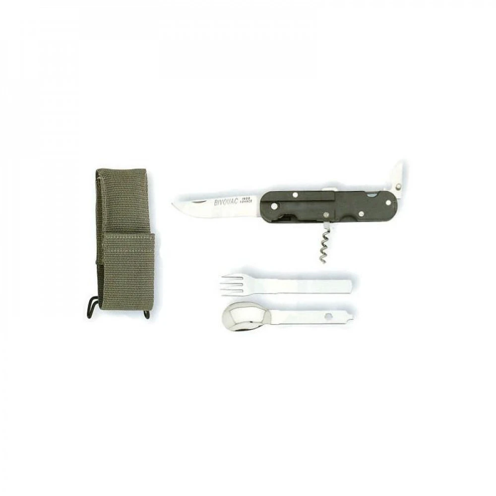 Sélectionné par l’armée, le couteau multifonction Bivouac est un modèle complet. Doté d’une fourchette, d’une cuillère, d’un couteau, d’un tire-bouchon, d’un décapsuleur et d’un ouvre-boîte, le couteau avec couverts Bivouac constitue un achat idéal pour la randonnée, le camping, la survie. Le manche est en ABS, les outils et couverts sont en inox. Remarque : livré avec un étui.