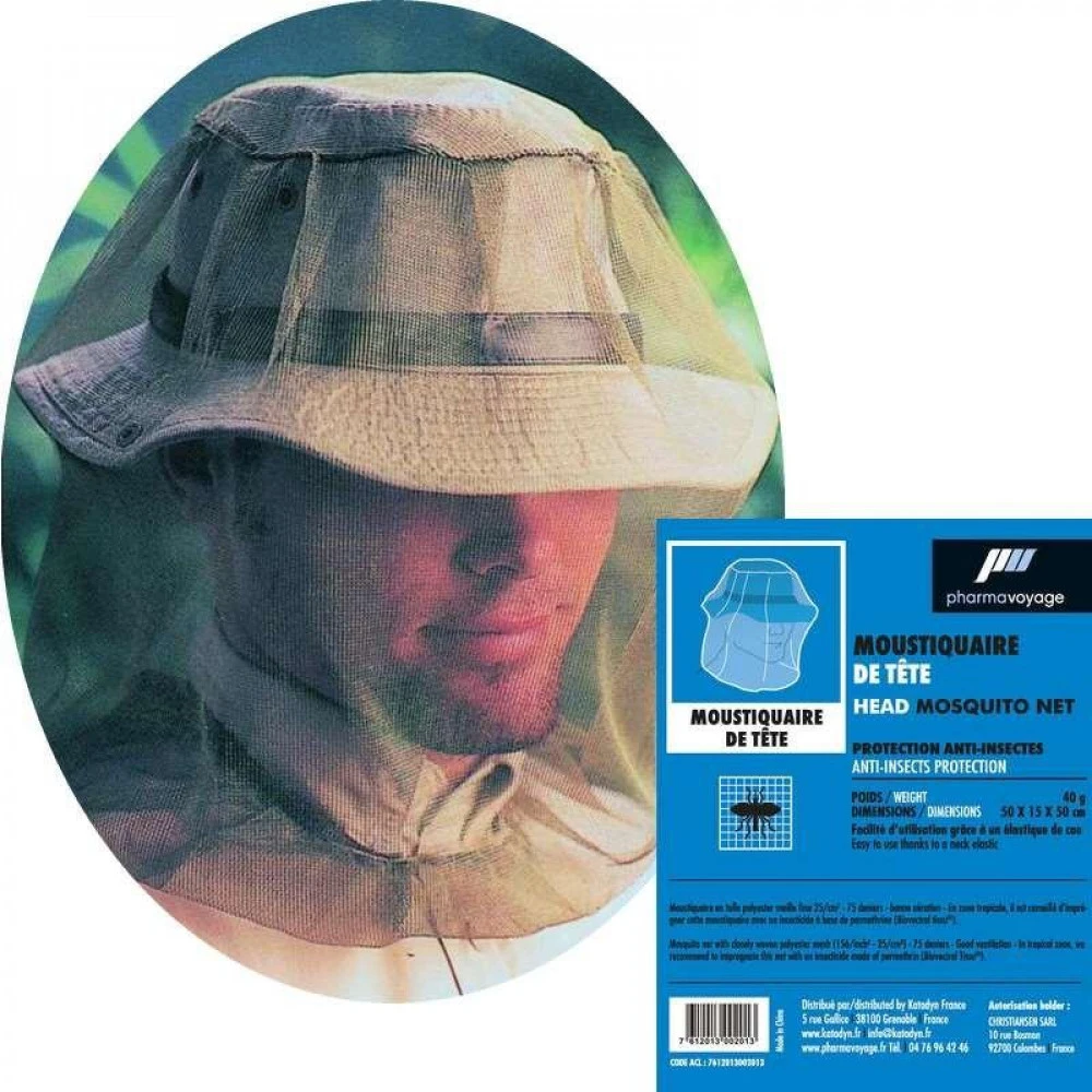 Protégez votre tête contre les moustiques et les insectes grâce à la moustiquaire de tête Pharmavoyage. C’est une protection anti-insectes pour adulte ou enfant. Parce qu’elle possède un élastique de cou, elle s’installe facilement et rapidement. La maille fine de 25 trous par cm2 en polyester 75 deniers assure une bonne protection et une bonne aération. Poids : 40 g. Taille : 50 x 15 x 50 cm.
