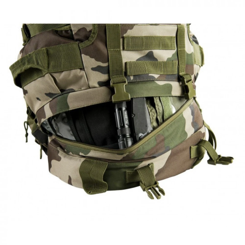 - Une poche dorsale intérieure avec deux sorties tuyau (gauche/droite) pour sac d’hydratation 1,5 litre